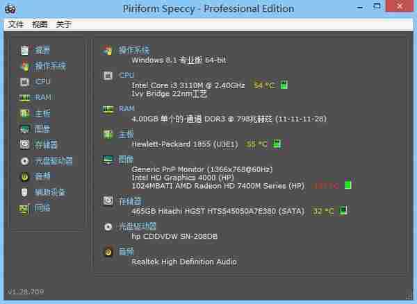 Speccy 是由 Speccy 是由 Pirifom 公司推出的系统免费硬件检测工具,检测计算机中所有硬件详细统计信息,包括CPU、主板、内存、显卡、硬盘、光驱等。通过它,让你对电脑硬件做到彻底了解。Speccy这样的实用小工具,体积小,占用资源也不大,个人建议电脑可以必备一个。如果您希望深入了解电脑各个部件的专业信息,那么 AIDA64 在这方面则无疑更专业最强大,你应该可以考虑选择!